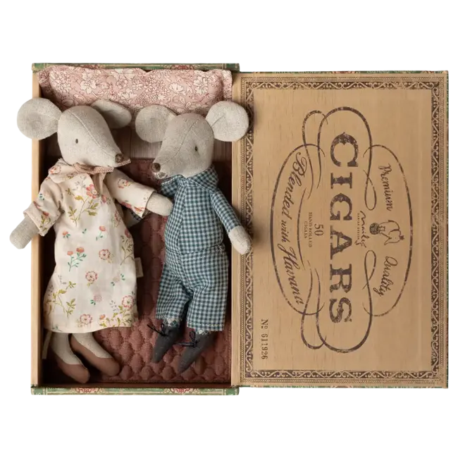 Véritable classique Maileg, les grands-parents souris dans leur boîte à cigares invitent à ralentir le tempo et à savourer la douceur des histoires du soir. Grand-mère, élégante même en chaussons à talons, et grand-père portent de charmants vêtements de nuit, prêts pour une nuit paisible dans leur boîte à cigares, transformée en lit douillet.