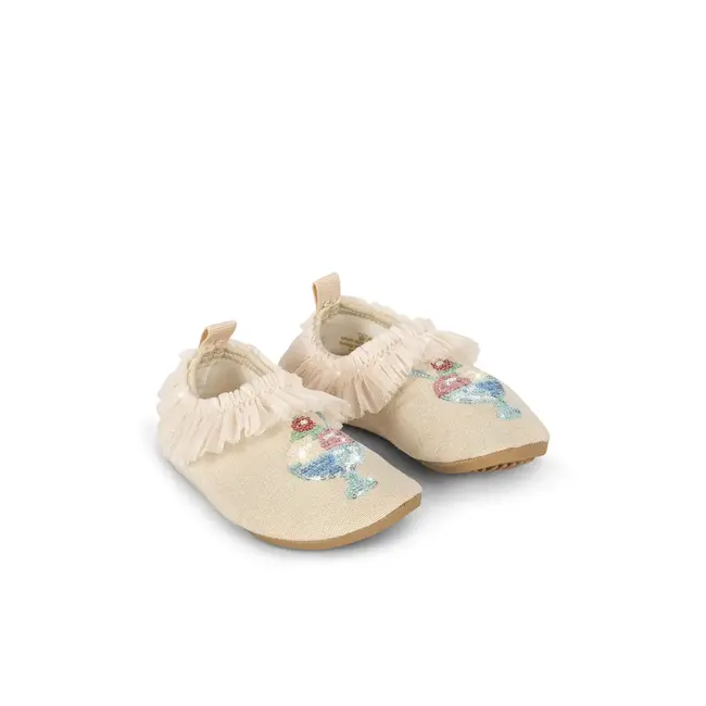 Ornés de paillettes et de sequins colorés dessinant une coupe de glace, ces chaussons de bain enfant séduisent par leurs volants délicats et leur allure pétillante. Confectionnés dans une matière souple et à séchage rapide, ils épousent confortablement la forme du pied pour accompagner les jeux aquatiques sans contrainte.