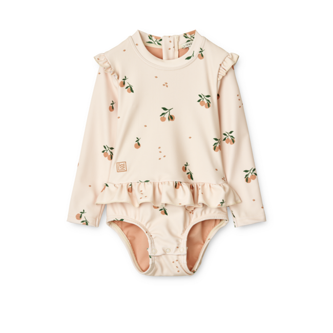 Un vent de douceur souffle sur les journées ensoleillées avec le maillot de bain UV bébé Sille Peach Sea Shell Liewood. À la fois protecteur et délicatement orné, il accompagne bébé dans ses premières aventures au bord de l’eau.