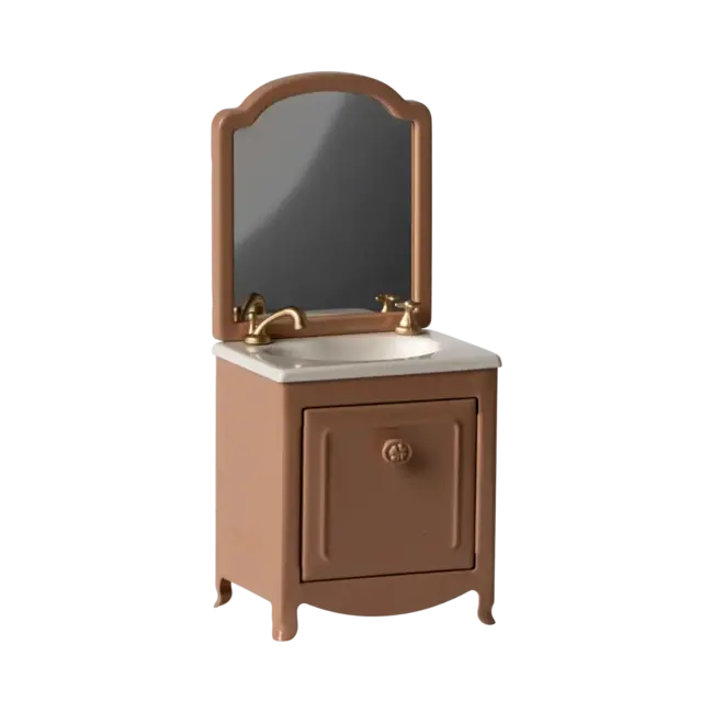 Dotée d’un joli miroir et d’un espace de rangement sous l’évier, cette coiffeuse miniature Maileg permet d’imaginer mille scènes du quotidien : se préparer, se laver, se pomponner…