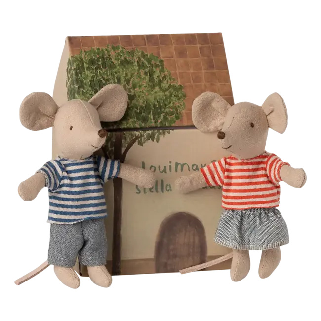 Découvrez LouiMax et Stella, le duo de souris Petit Frère & Petite Sœur qui s’intègre parfaitement dans la maison souris mobile SuitCasa. Adorables et vêtues de leurs tenues soignées, elles stimulent l’imagination et invitent à inventer mille scénarios tendres et poétiques.