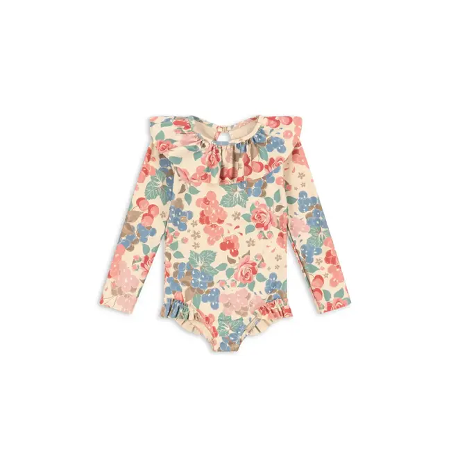 Quand viennent les premiers bains de soleil, le maillot de bain Manuca Bloomiegrape accompagne les bébés avec délicatesse. Signé Konges Slojd, ce modèle à manches longues séduit par ses volants aux épaules et son imprimé floral subtil, tout en offrant un confort optimal pour les journées au bord de l’eau.