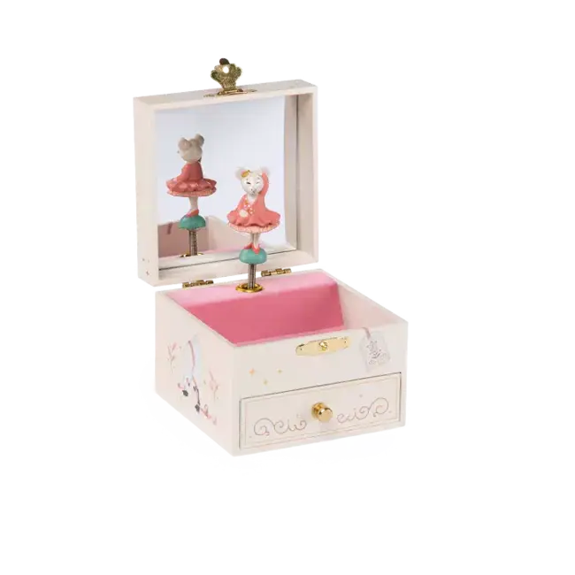 Pensée comme un véritable écrin, elle abrite un petit tiroir secret pour conserver bijoux, trésors et confidences, ainsi qu’un miroir pour s’admirer et rêver. À la fois objet décoratif et jouet musical, elle accompagne les moments calmes, le rituel du coucher ou les instants de rêverie avec toute la poésie chère à Moulin Roty.