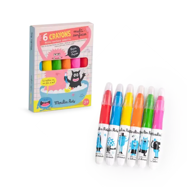 Place à la créativité sans limites avec les 6 crayons multisurfaces Moulin Roty Les Schmouks ! Ici, tout devient terrain d’expression : vitres, baignoire ou feuille de papier… les petits artistes n’ont plus qu’à laisser parler leur imagination.