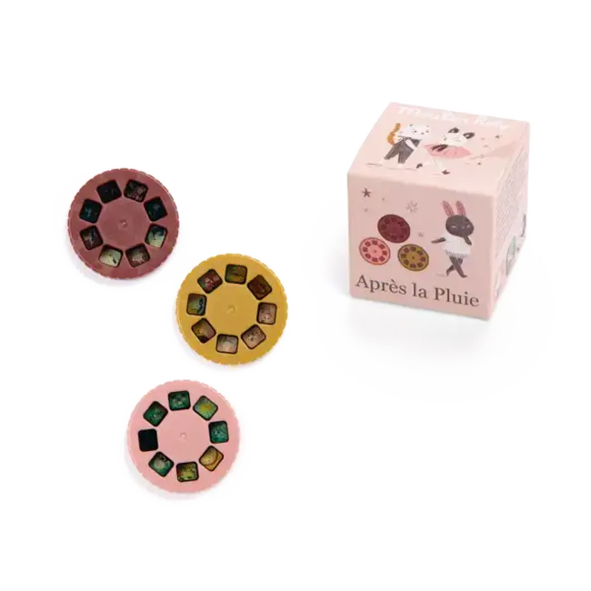 Quand les lumières s’adoucissent, les disques à histoires Moulin Roty révèlent la délicatesse de l’univers Après la pluie. Cette boîte de 3 disques à histoires permet de renouveler les récits projetés et d’accompagner les enfants dans une transition paisible vers le sommeil.