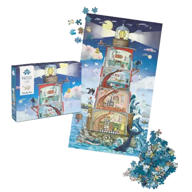 Avec ce puzzle Moulin Roty de 500 pièces, les enfants dès 8 ans partent à la découverte d’un phare haut en couleur, niché au bord d’une mer foisonnante de vie.