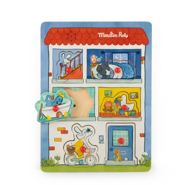 Avec le puzzle sonore maison Moulin Roty, l’éveil se fait à la fois visuel, tactile et auditif. Issu de la collection Puce & Pilou, ce puzzle en bois sonore invite les tout-petits à reconstituer la maison en replaçant 6 pièces illustrées, chacune déclenchant un son du quotidien : sonnette, téléphone et autres bruits familiers.