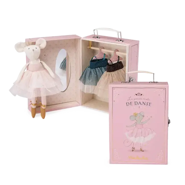 La valise La petite penderie Moulin Roty ouvre un monde de grâce et de paillettes. Issue de la collection La petite école de danse, cette valisette armoire invite les enfants à entrer dans le dressing de la Petite Souris, entre essayages et répétitions imaginaires.