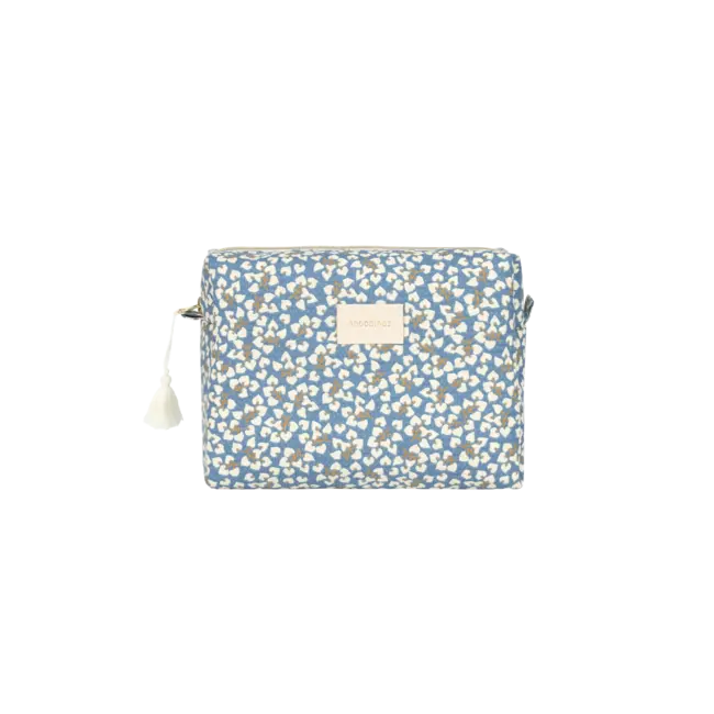 Une grande trousse de toilette Nobodinoz au motif fleuri "Blue Yumiko" ornée d'un joli pompon qui lui confère un air de Diva...! Le petit plus : son intérieur imperméable en PVC sans Phthalate évitant les petits accidents des lotions et crèmes qui tâchent