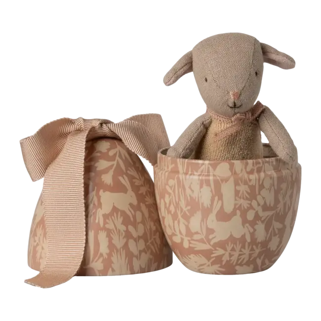 Une scène miniature empreinte de poésie se cache dans l’œuf de Pâques avec agneau Micro – Rose poudre signé Maileg. Cet œuf en métal, délicatement décoré et orné d’un grand nœud souple, abrite un petit agneau Micro au toucher tout doux, prêt à partager la magie du printemps.
