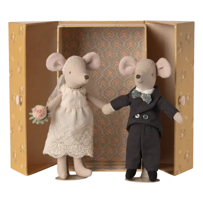 Une belle histoire d’amour prend vie avec le papa et maman souris – couple de mariés signé Maileg. La mariée, vêtue d’une robe blanche et d’un voile délicat, tient un joli bouquet, tandis que le marié, très élégant dans son smoking, l’accompagne pour célébrer ce grand jour. Présenté dans un beau coffret imprimé Maileg, cet ensemble devient une pièce centrale de l’univers miniature.