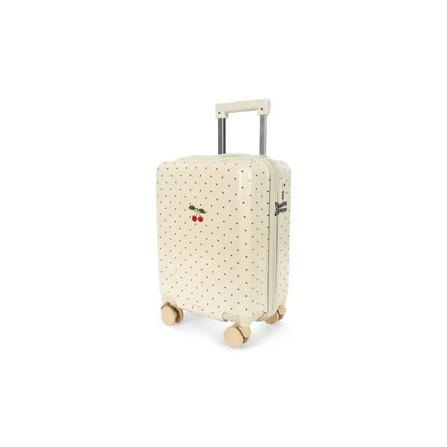Prêts pour le départ. La valise à roulettes Cerise Navy Dots signée Konges Slojd transforme chaque escapade en voyage soigneusement orchestré. Avec son motif cerises emblématique sur fond marine à pois, elle conjugue allure joyeuse et fonctionnalité bien pensée, pour suivre les enfants dans toutes leurs aventures.